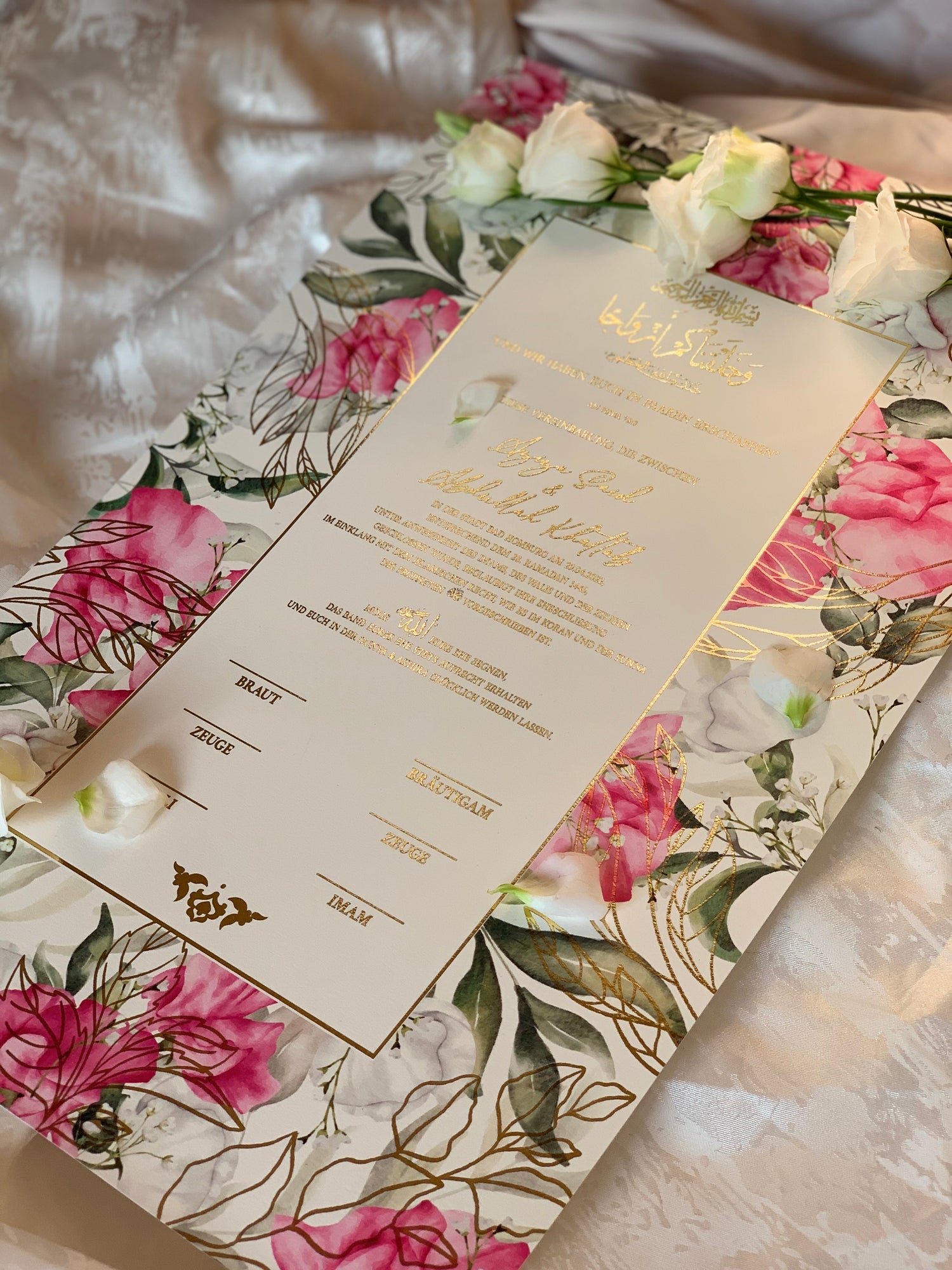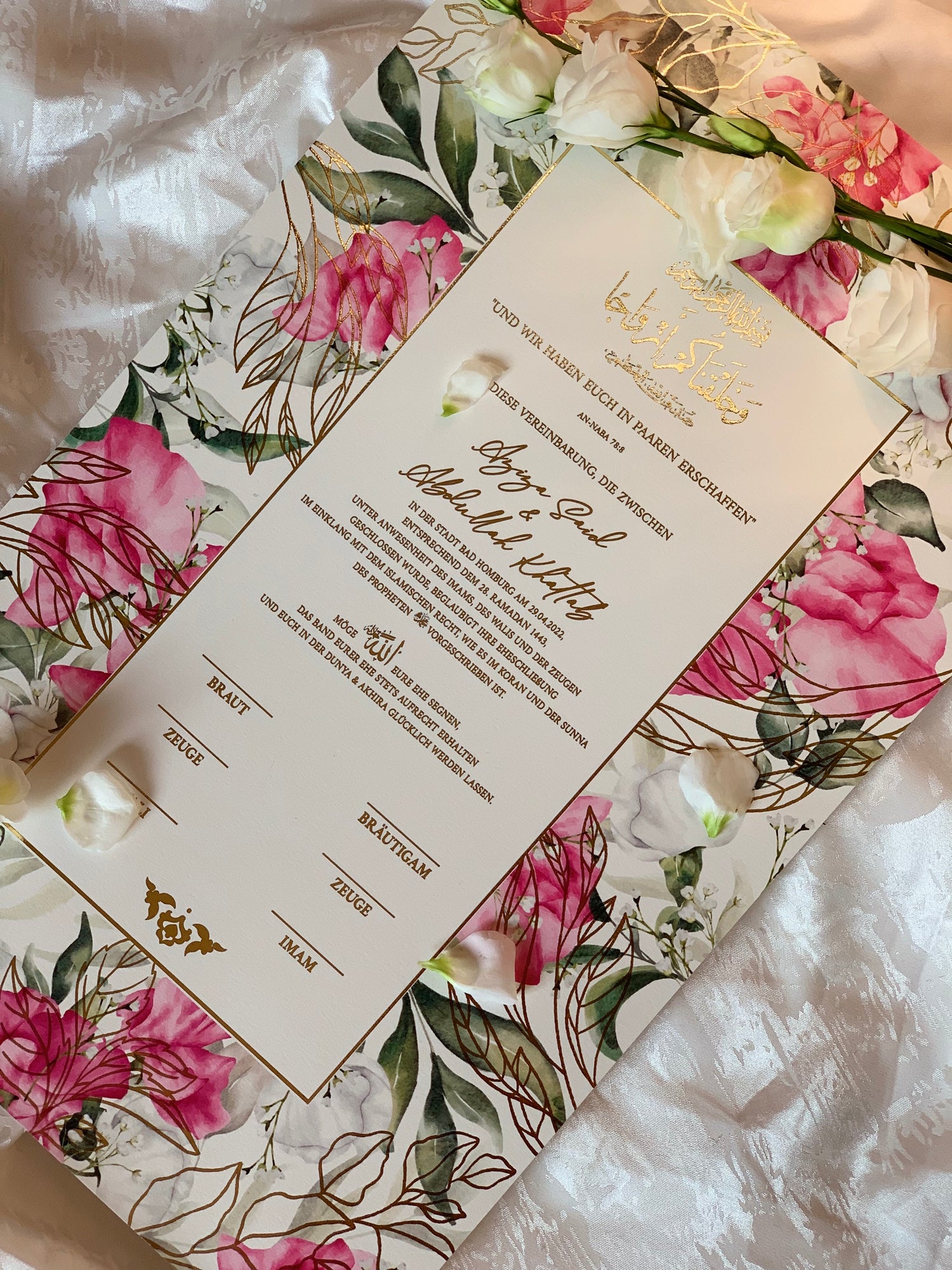 Das Nikah-Zertifikat benötigt rund 4-5 Werktage zur Erstellung. Wir bitten Euch Eure Bestellungen frühzeitig zu tätigen, damit wir inkl. Versandzeit Euer Zertifikat rechtzeitig liefern können. Wir wollen natürlich nicht, dass Ihr bei der Planung dieses schönen Tages in Zeitstress geratet.