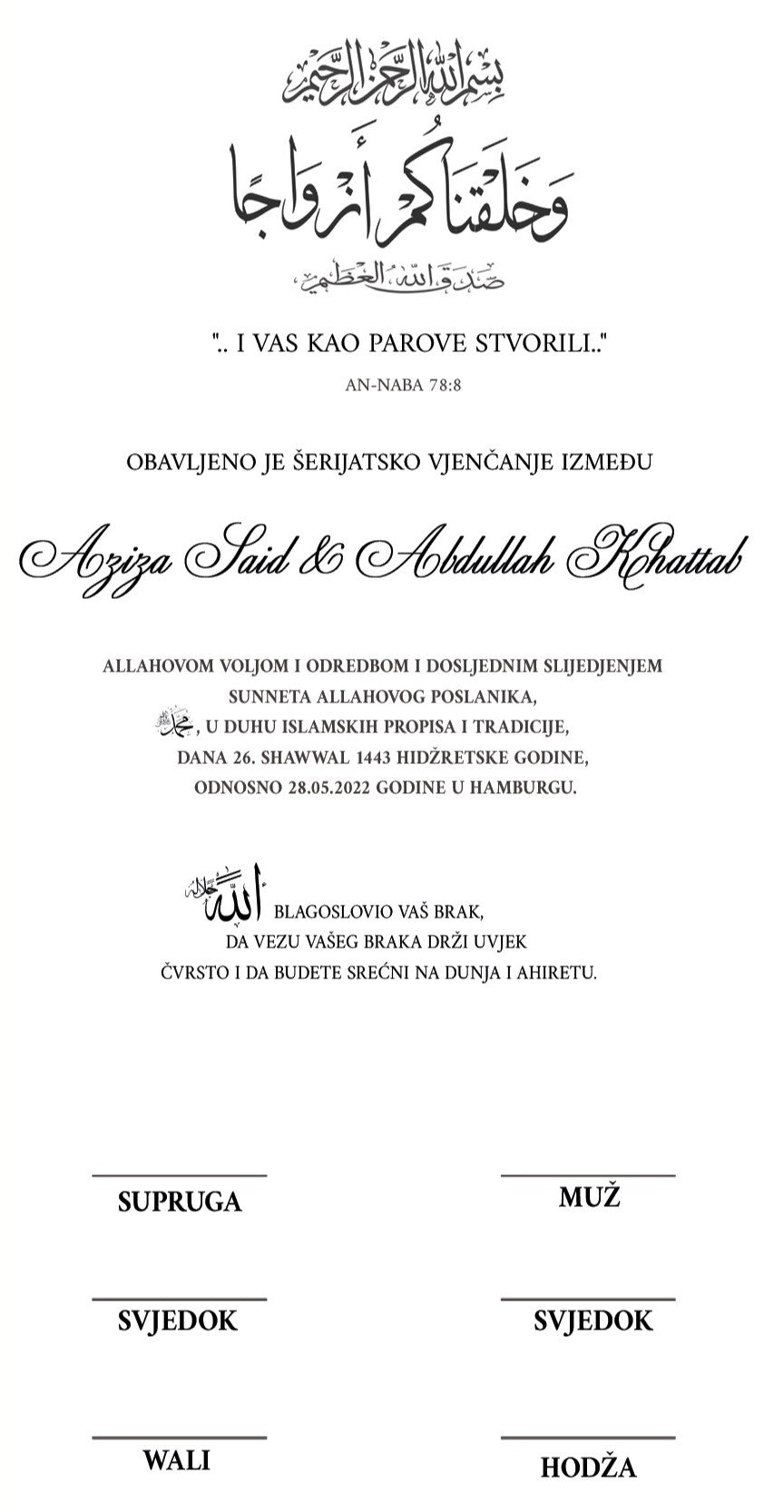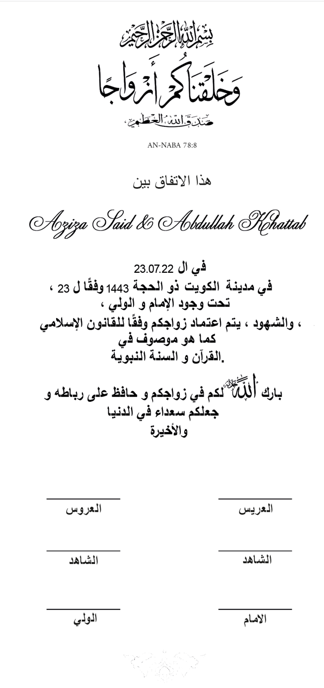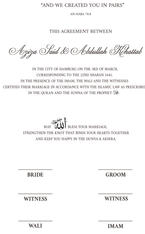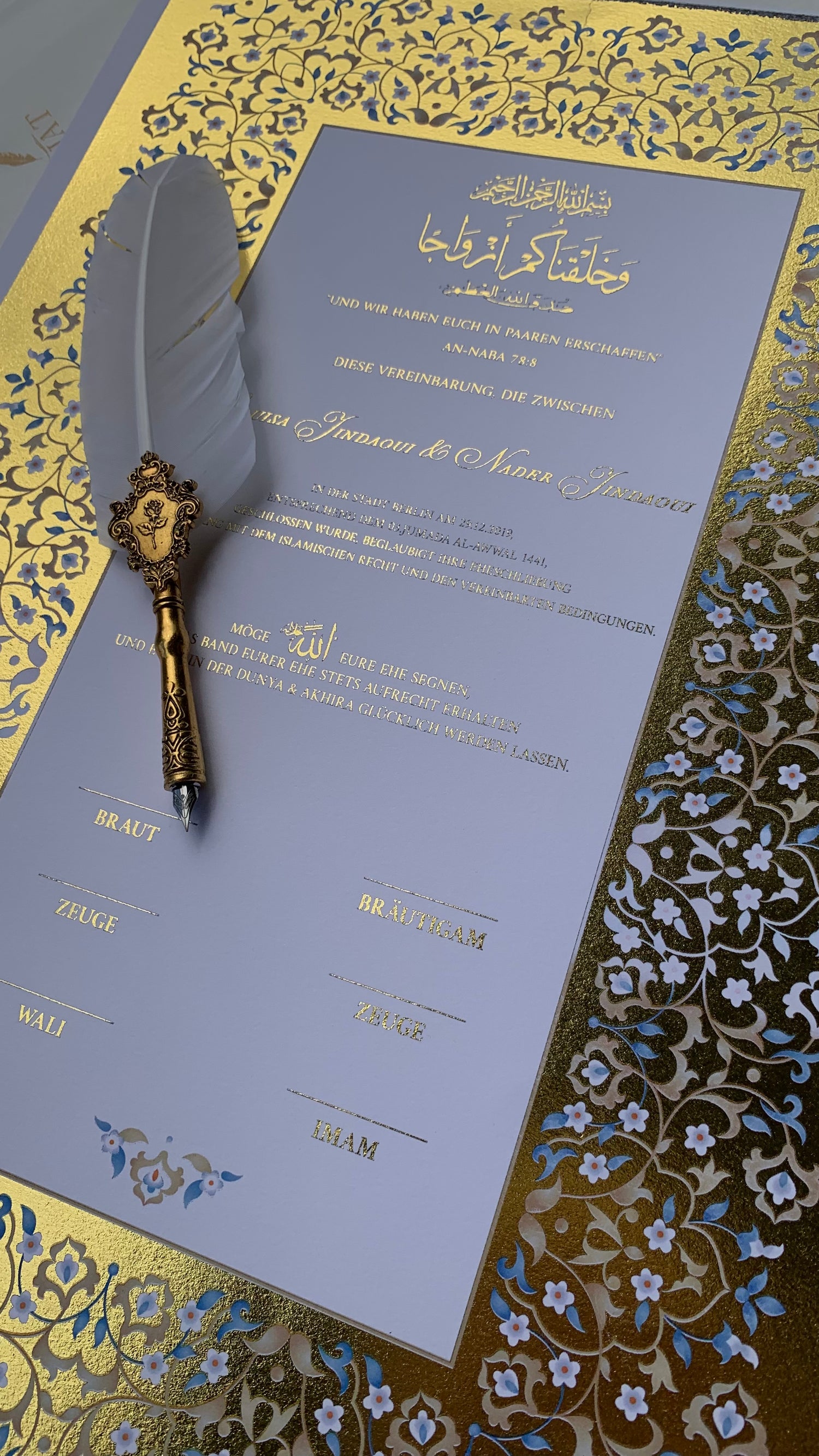 The Nikah certificate takes around 4-5 working days to create. We ask you to place your orders early so that we can deliver your certificate in good time, including the shipping time. Of course we don't want you to get into time stress when planning this beautiful day.